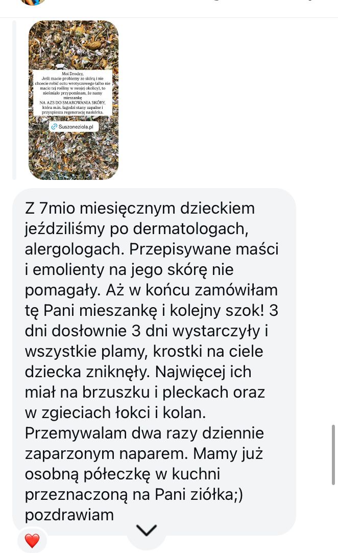 Autorska kompozycja ziół do stosowania zewnętrznego o działaniu przeciwzapalnym i regenerującym skórę. Może być stosowana wspomagająco w leczeniu atopowego zapalenia skóry.
